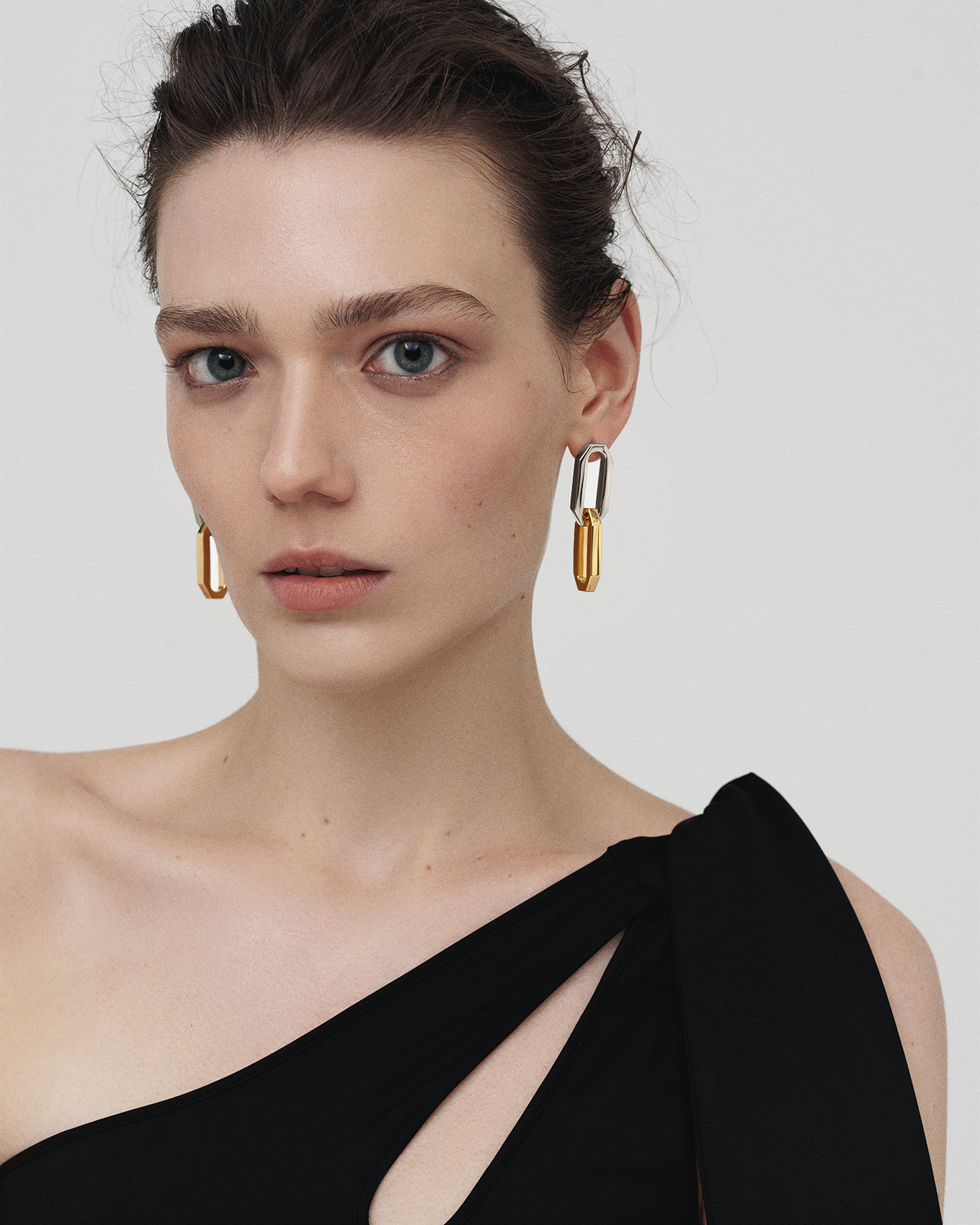 The contrast of colors works as a visual rhythm: it emphasizes the structure, depth and volume of the jewelry. The earrings move in time with the body, gently catching the light and reflecting it with their edges. They are a perfect match for the urban pace, clear silhouettes and bold stylistic decisions.