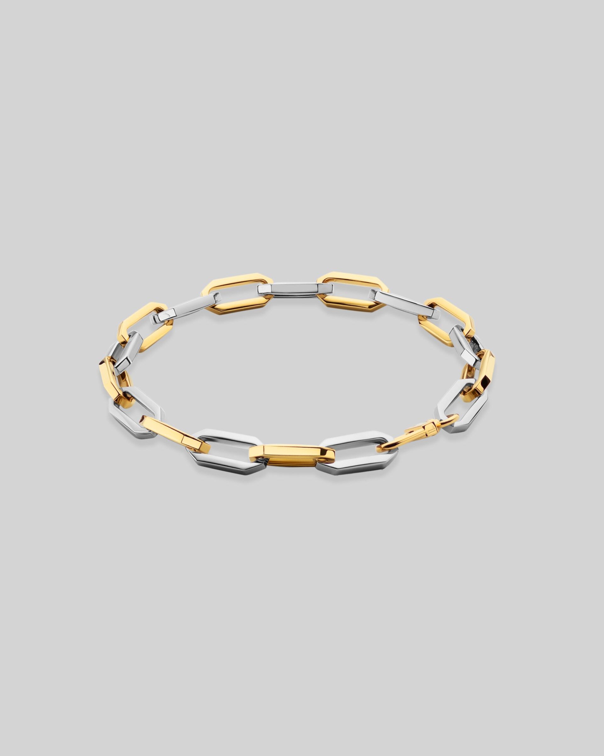 Choker Bicolor is a dialog between two poles. Cold palladium and warm gold alternate in a clear rhythm, like two voices interacting without argument. Volumetric links, each with a precise cut, form a line around the neck that looks holistic but not static.