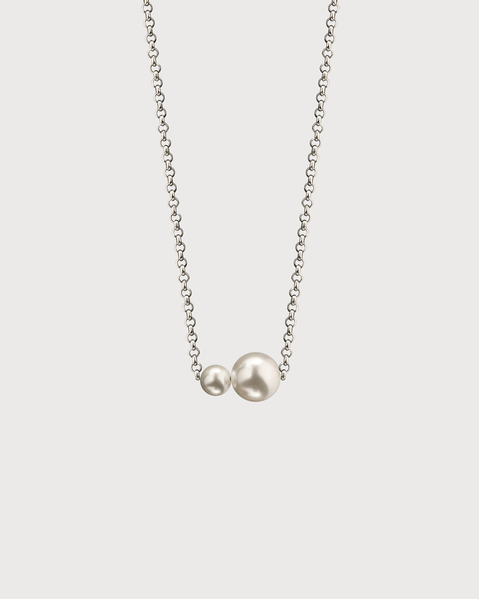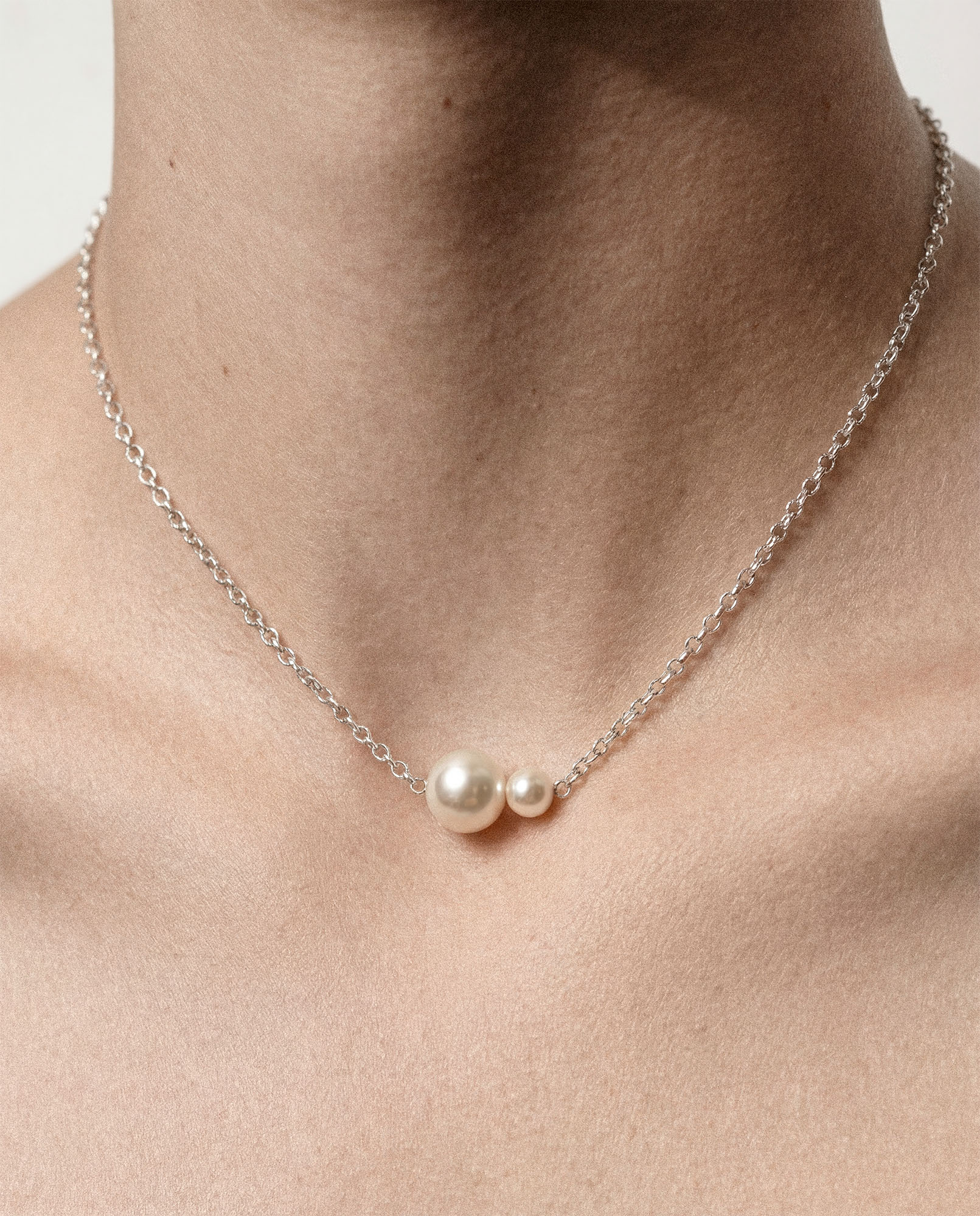 The thin chain is harmoniously combined with two pearls of different sizes, creating a delicate composition with a slight asymmetrical character. This design looks modern, but at the same time retains a classic aesthetic that never goes out of style.