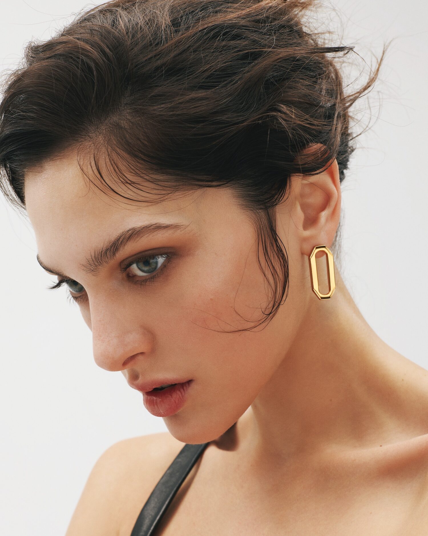The single link earrings are about a concentrated form that does not need any additions. The geometry of the hexagon with beveled edges creates the perfect balance: enough volume to attract the eye, yet enough lightness to remain discreet.