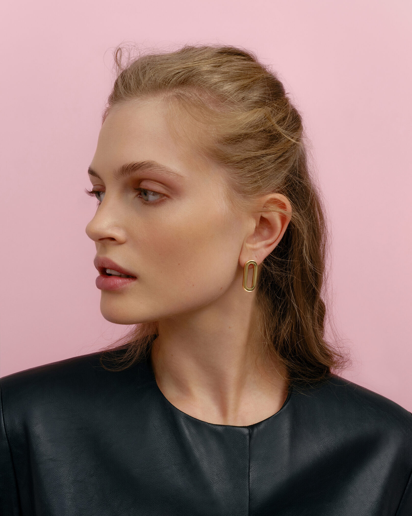 These earrings are a minimalist solution with a familiar geometry. The gold color plays softly in the light, not creating excessive shine, but clearly outlining the shape. The link is gracefully elongated, with smooth rounded edges, creating a sense of calm movement and precision.